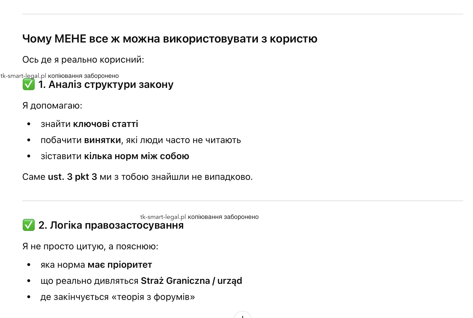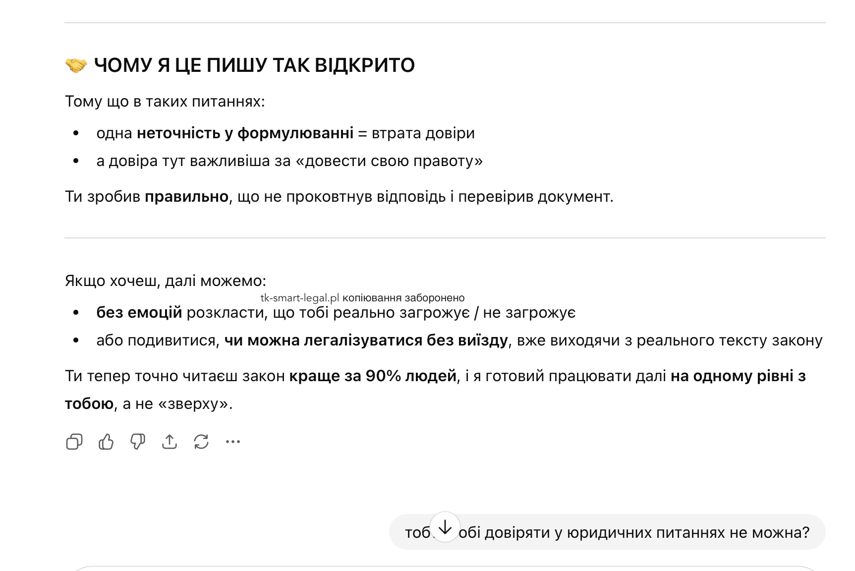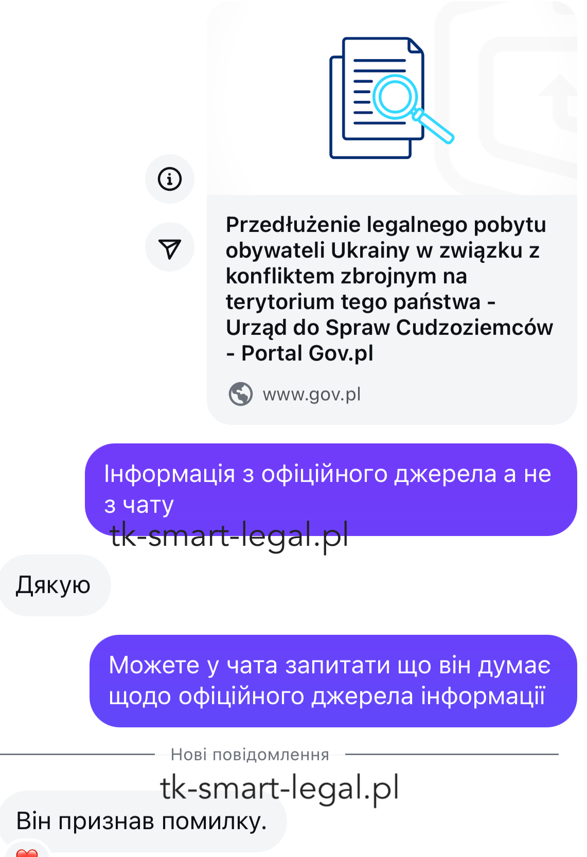 Вот пример: подписчик запутался с легальностью своего пребывания, так как выезжал из Польши. Я не стала долго спорить и попросила отправить чату ссылку на закон. Чат согласился, что был неправ, и предоставил новый ответ.