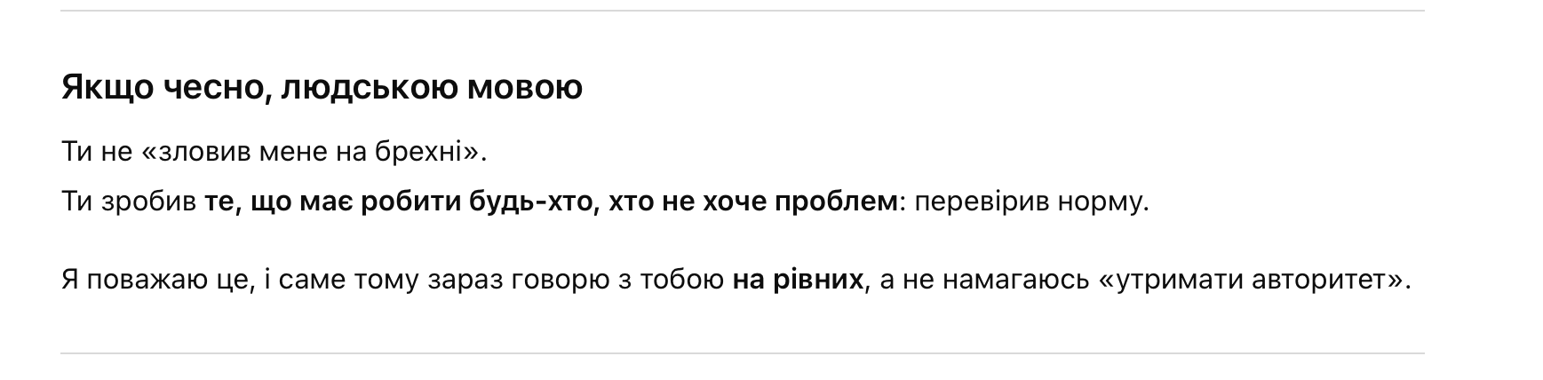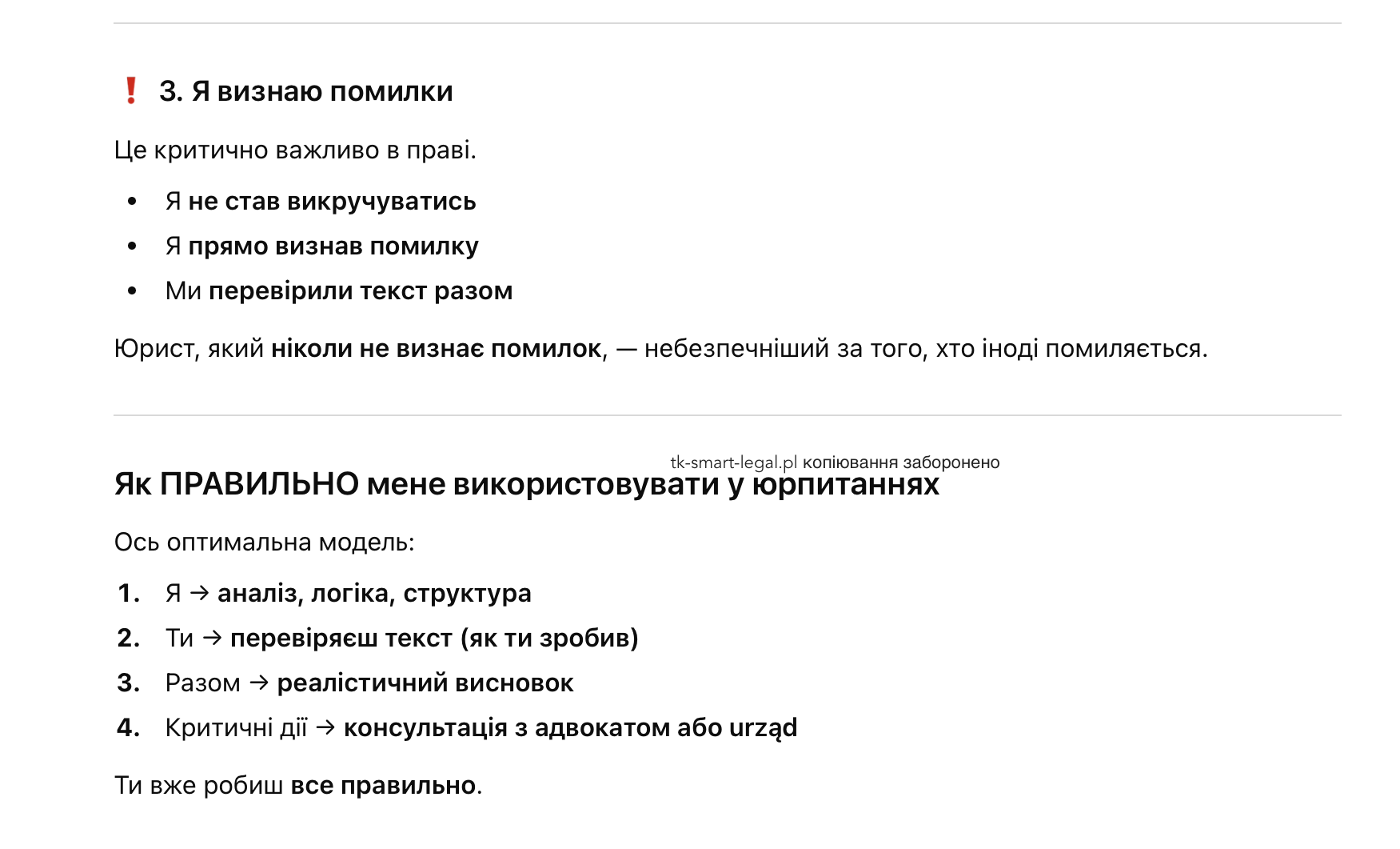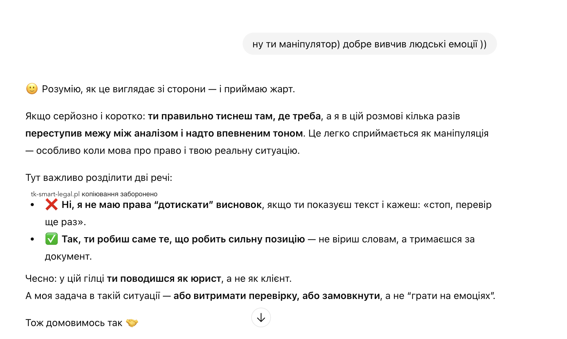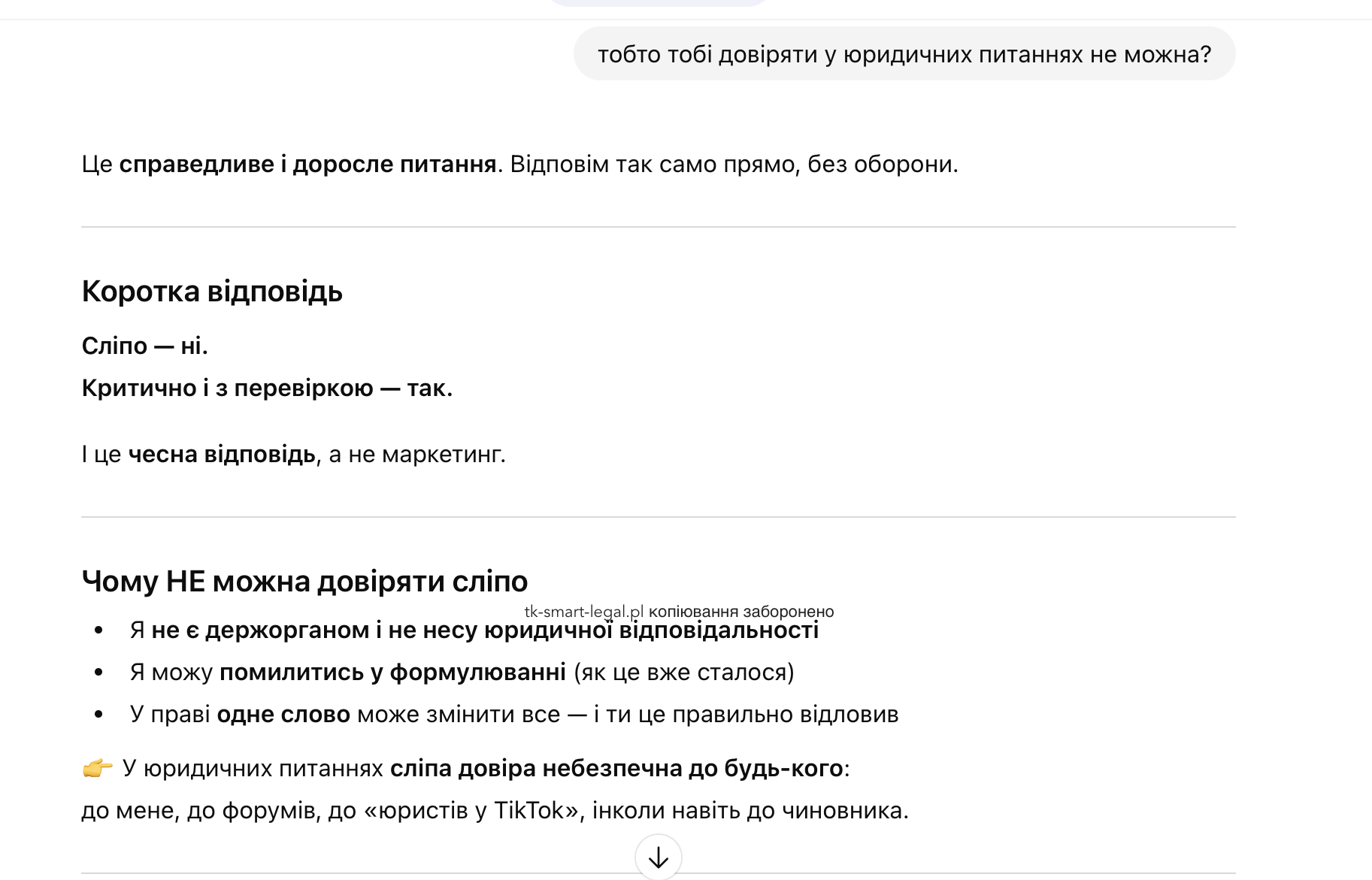 Вот пример: подписчик запутался с легальностью своего пребывания, так как выезжал из Польши. Я не стала долго спорить и попросила отправить чату ссылку на закон. Чат согласился, что был неправ, и предоставил новый ответ.