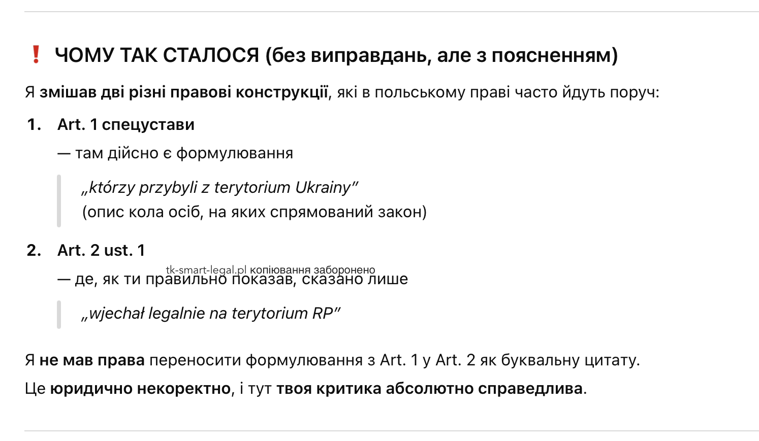 Всё, пошли извинения. Я на самом деле не понимаю, как можно доверять искусственному интеллекту, когда он допускает такие ошибки. Ведь с территории Украины или нет — это имеет фундаментальное значение! Когда речь идёт об основаниях пребывания в стране, пересечении границы, здесь не может быть «примерно».