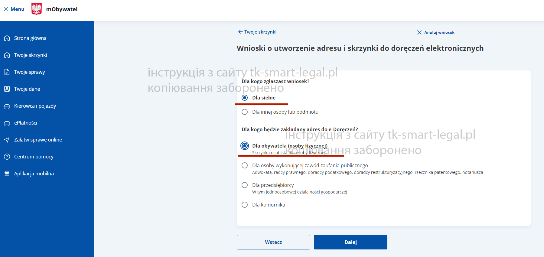 4. Далее выбираем “dla siebie” и “dla osoby fizycznej”.