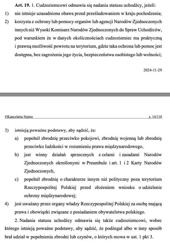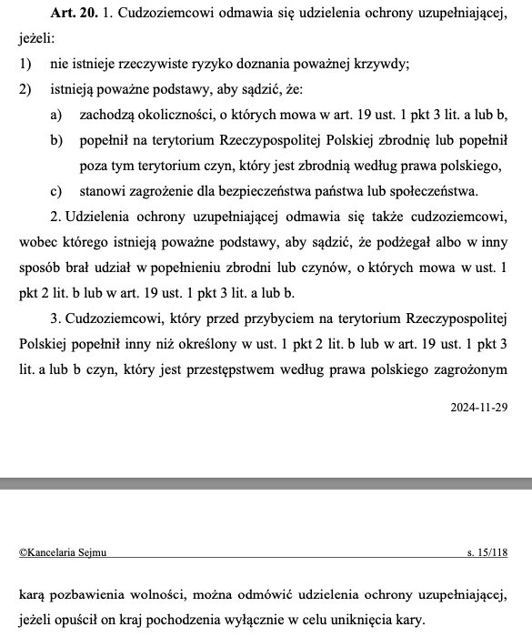 - Иностранец, который до въезда на территорию Республики Польша совершил деяние, отличное от указанного в ст. 19 пункт 1 подпункт 2, буква b) или в ст. 19 пункт 1 подпункт 3, буква a) или b), деяние, которое согласно польскому законодательству является преступлением, наказываемым лишением свободы, может быть отказано в предоставлении дополнительной защиты, если он покинул страну происхождения исключительно с целью избежать наказания.