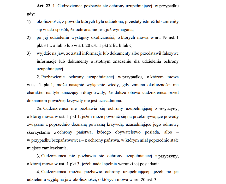 Art. 22. 1. Cudzoziemca pozbawia się ochrony uzupełniającej, w przypadku gdy: 1) okoliczności, z powodu których była udzielona, przestały istnieć lub zmieniły się w taki sposób, że ochrona nie jest już wymagana;
