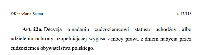 Art. 22a. Решение о предоставлении иностранцу статуса беженца или дополнительной защиты утрачивает силу по закону в день приобретения иностранцем гражданства Польши.